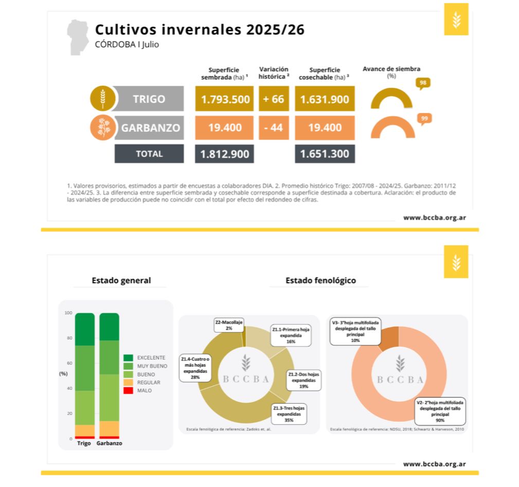 Durante la primera quincena de julio, el trigo y el garbanzo enfrentan un inicio de ciclo desafiante en la provincia de Córdoba. Según el último relevamiento agronómico de la Bolsa de Cereales de Córdoba (BCCBA), las fuertes heladas registradas entre fines de junio y principios de julio, junto con un marcado déficit hídrico, afectaron el desarrollo inicial de estos cultivos.
