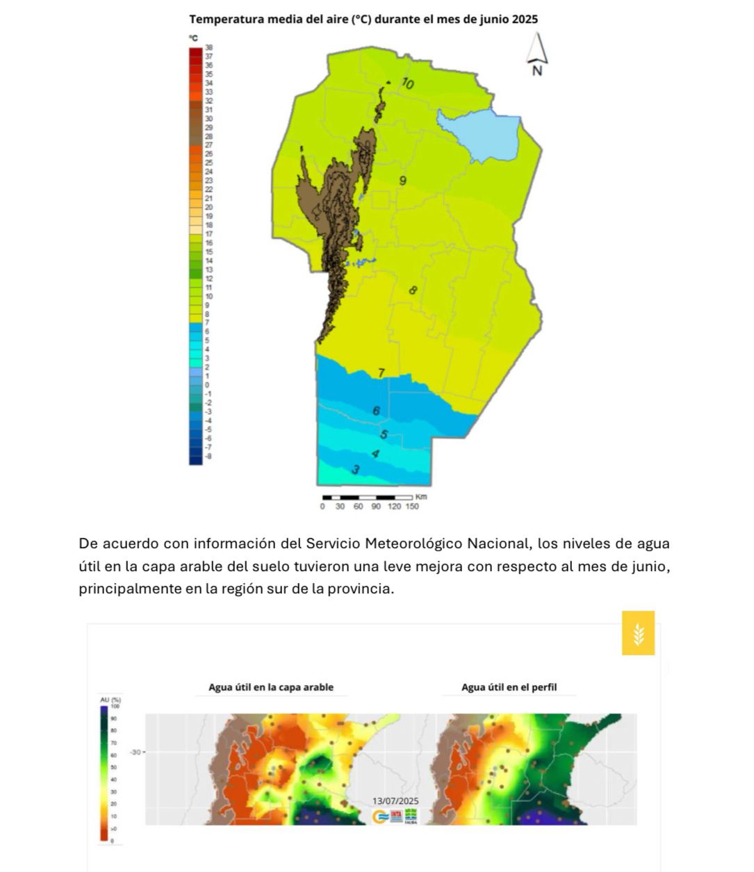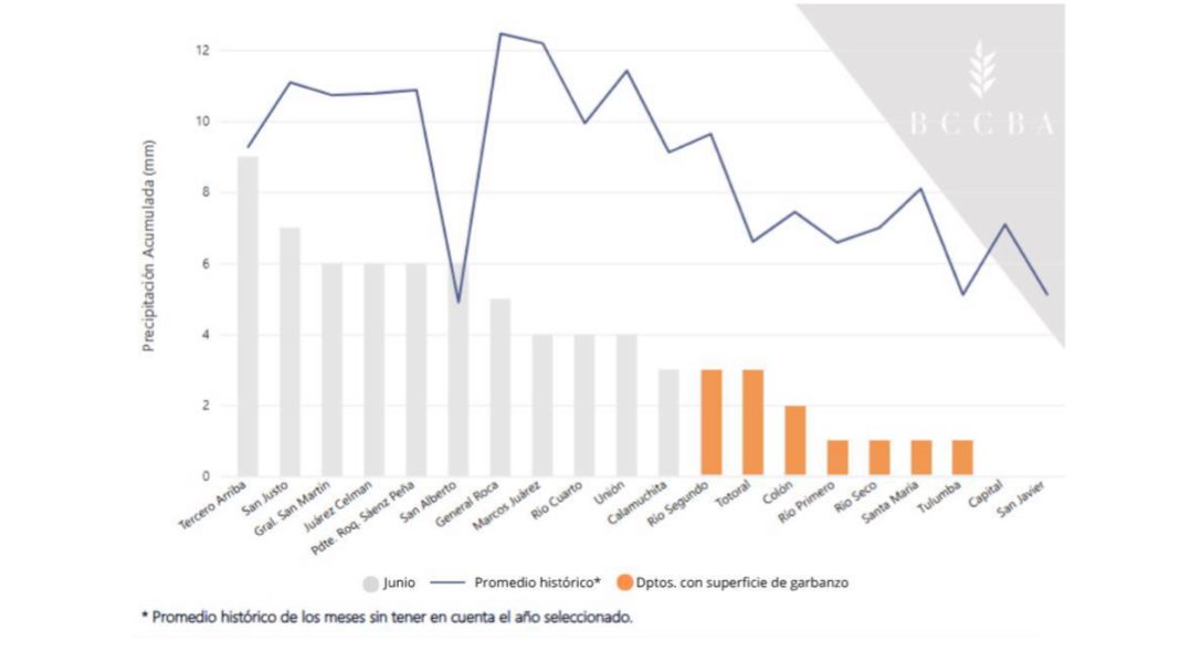 Desde el punto de vista climático, junio fue un mes con lluvias por debajo del promedio en toda la provincia, siendo los departamentos productores de garbanzo los más afectados. Las temperaturas medias fueron entre 5 y 7 °C más bajas que las registradas en junio del año pasado, profundizando los riesgos por heladas. Las temperaturas ideales para esta etapa son de 18 °C para garbanzo y 16 °C para trigo, valores que estuvieron muy por debajo durante el mes pasado.