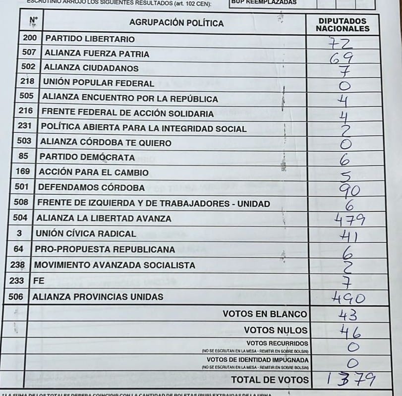 En total, se contabilizaron 1.379 votos, de los cuales 43 fueron en blanco y 46 nulos.