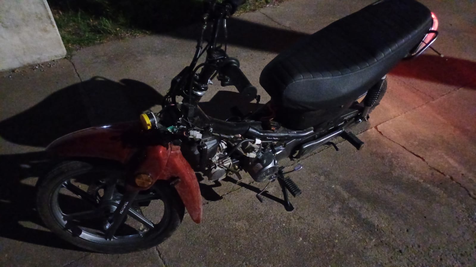 Sale uno de los chicos y le indica el lugar donde la moto estaba, van a buscarla no le encuentran y con la mamá que los acompañó vuelven, la madre ingresa a la casa hace salir a otro de los chicos y el otro nunca salió que es el más grande y supuestamente el responsable mayor, con el chico van al lugar donde le dice que está la moto la buscan y mi hijo la encuentra tirada entre los pastizales, toda rota y solamente con un plástico, los otros ninguno, todo roto en el sistema de arranque, el velocímetro, bueno la destrozaron prácticamente así que la la dejo en Isla Verde de gente conocida.